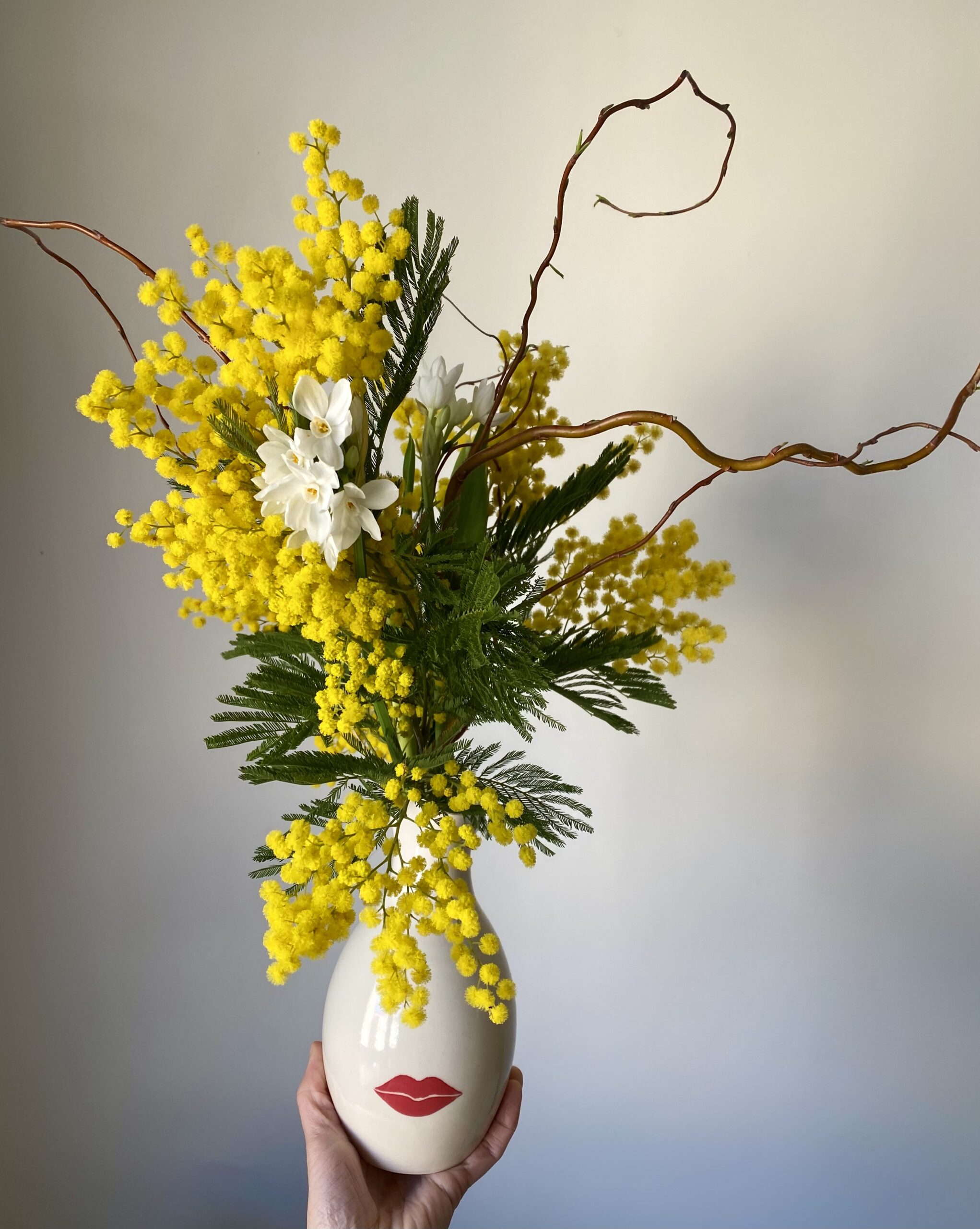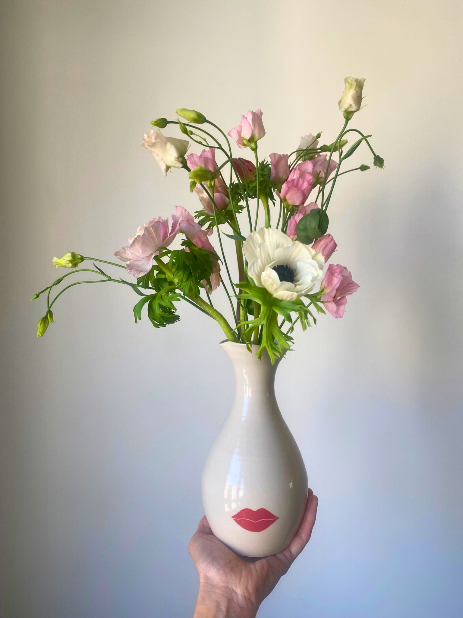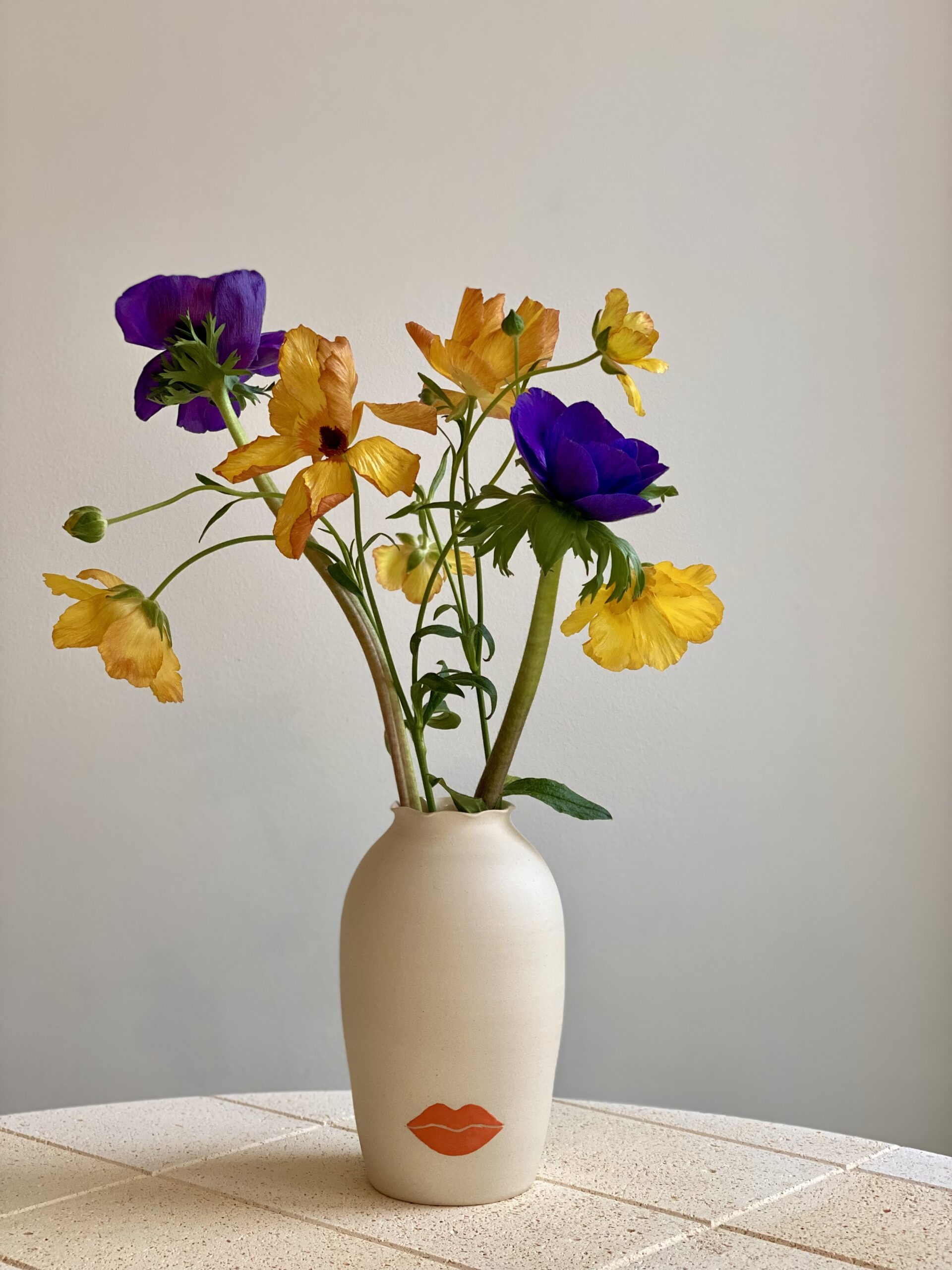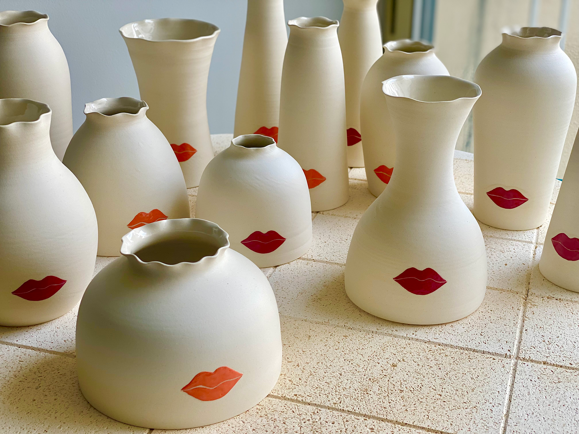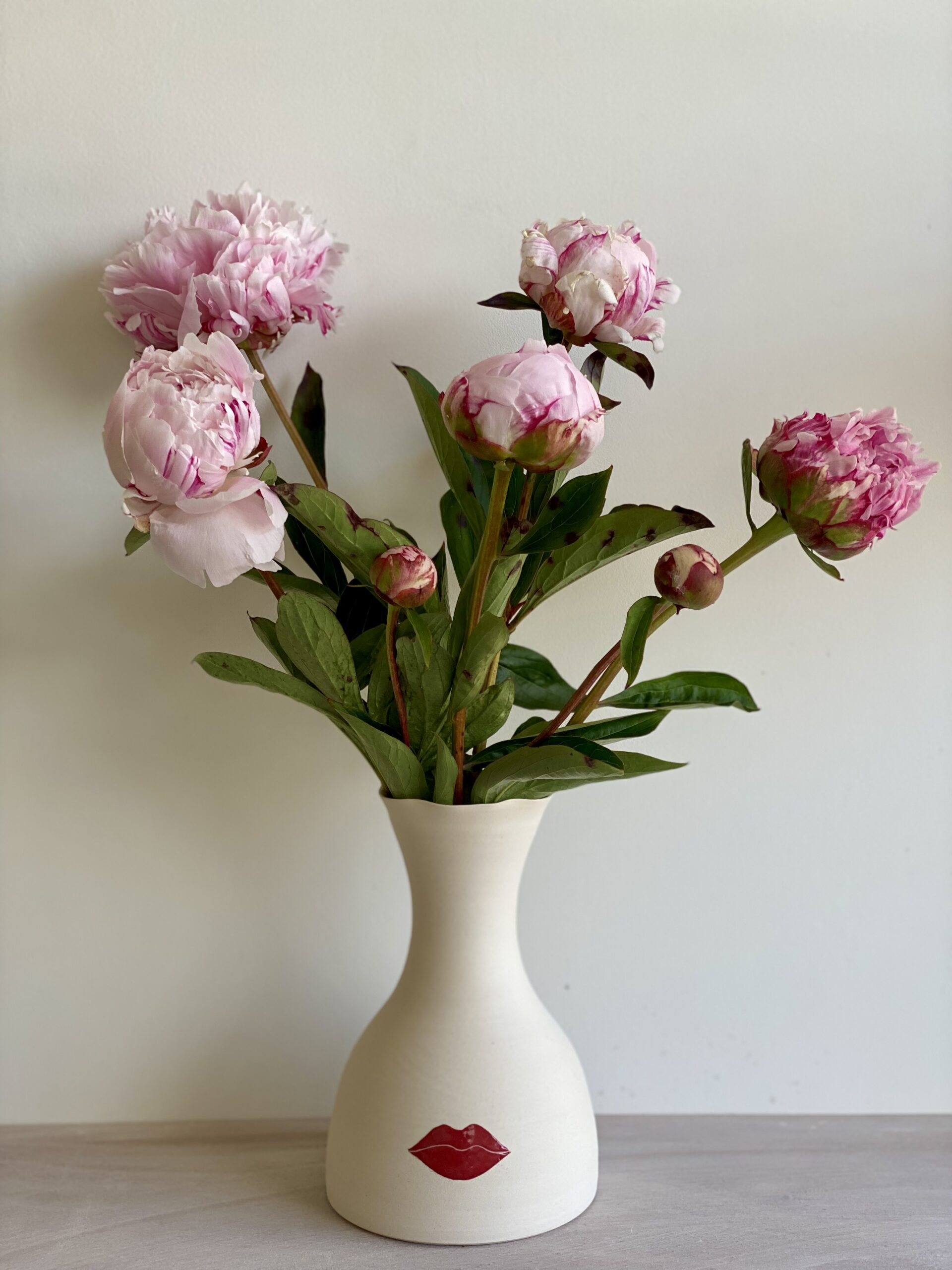 Derrière les Vases Confidences lorsqu’ils sont garnis de fleurs, imaginons le visage femme avec comme seul détail une bouche délicate.
